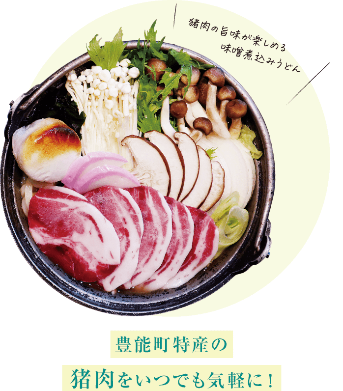 1年中猪肉が味わえるお店。一番人気の「ししなべ味噌煮込みうどん」は、地元産野菜もたっぷりでボリューム満点の一人鍋。