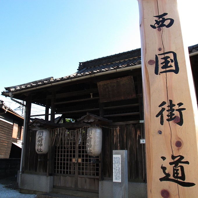 関戸明神、関明神社、関戸神社とも呼ばれます。旧西国街道沿い、山城と摂津の国境に位置し、正面東には「従是東山城国(これよりひがしやましろのくに)」と刻んだ国界碑が建てられています。現在は傍らを流れる小川が大阪府と京都府の府境となっています。創建は不祥ですが、祭神は大己貴命・天児屋根命、または大智明神とも伝わっています。古代の関所「山崎関」跡といわれ、平安時代に関所が廃止された後は、貴族や官人の宿泊施設「関戸院」が設けられました。京から西国に下る貴族と見送りの人がこの場所で別れを惜しんだといわれています。本殿は室町時代中期頃に建てられたといわれ、大阪府指定文化財となっています。