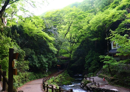 阪急箕面駅から箕面大滝に続く2.7kmの道は「滝道」と呼ばれ、沿道には箕面名物「もみじの天ぷら」を揚げる土産物店が軒を連ねています。駅から滝まで進むに連れて、現代、近代、中世、古代と、時代の変化が感じられ、独特の空気感を醸しだしています。