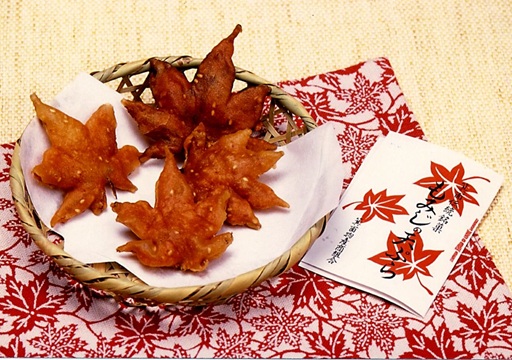 箕面を代表する土産物である「もみじの天ぷら」は、約1300年前、箕面山で修業していた役行者が滝に映えたもみじの美しさを賞賛して、自然の風味をいかした天ぷらをつくり、修験道場を訪れる旅人に供されたと言われています。良質の小麦粉に白ゴマ、砂糖を加えた衣をつけて菜種油でからっと揚げられます。店先で揚がる姿は、滝道の風景となっています。